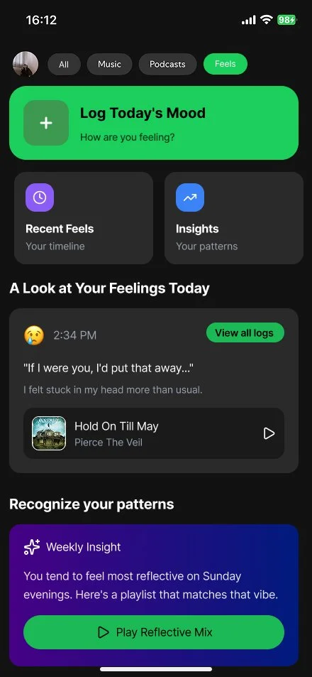 A new “Feels” tab at the top of the Home feed dedicated to reviewing saved lyrics, moods, and emotional trends.