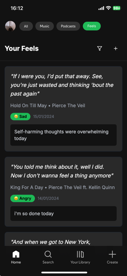 A new “Feels” tab at the top of the Home feed dedicated to reviewing saved lyrics, moods, and emotional trends.